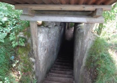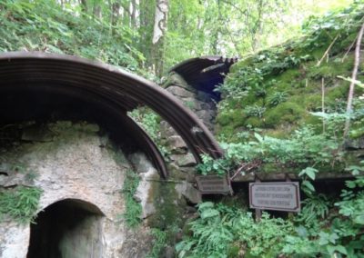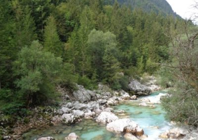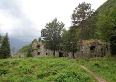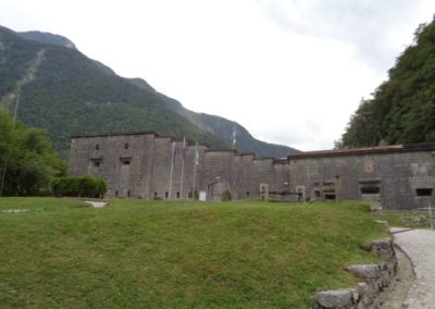 Proseguimmo quindi verso la seconda tappa del viaggio ovvero Bovec, o Plezzo in italiano, con l’Isonzo come fedele compagno di viaggio. Arrivati a Bovec ci dirigiamo a piedi verso Ravelnik, un museo a cielo aperto dove sono state ricostruite le trincee austriache. Dinnanzi ai nostri occhi si palesa una collina fitta di boschi che nasconde ogni traccia della Grande Guerra. È un invito ad andare a scoprirla. Così facendo iniziano ad affiorare i primi camminamenti, postazioni di comando e per cecchini e infine l’infermeria. Le difese originarie austriache, come detto prima sono scomparse e sono state ricreate a perenne memoria degli orrori della guerra. Il silenzio e la natura hanno preso il posto del frastuono dei cannoni e del filo spinato. La tranquilla e lussureggiante campagna slovena non è, però, ancora riuscita totalmente a rimarginare le cicatrici della guerra: in particolare restano ben visibili sulla sommità di Ravelnik i crateri delle granate italiane. Per completare la nostra visita dei luoghi della Grande Guerra a Bovec prendiamo la macchina e raggiungiamo i forti di Kluže e Hermann, posti a 10 minuti dal paese. Il forte di Kluže fu innalzato inizialmente nel XV secolo come struttura lignea per impedire che i Turchi attaccassero la Carinzia austriaca e nei secoli successivi il legno venne sostituito con la pietra, mentre la forma attuale venne data nel XIX. Durante la Prima Guerra Mondiale rivestì un ruolo importante nella difesa del settore e oggi ospita un piccolo museo sulla Grande Guerra. Forte Hermann, invece, si trova sulla cresta montuosa del Rombon che domina dall’alto la strettoia protetta dal forte di Kluže. Venne realizzato a fine XIX secolo dagli austro-ungarici ma venne reso inutilizzabile dai colpi dell’artiglieria italiana. Ancora oggi è possibile vederne i resti percorrendo un sentiero di 15/20 min tra i boschi. Se a Ravelnik abbiamo intuito quale potesse essere l’impatto di una granata, a Fort Hermann restiamo esterrefatti dal suo concreto potenziale distruttivo. Pareti, muri frantumati e postazioni di difesa scoperchiate attendono il visitatore. Purtroppo, e questo è un grande rammarico, il sito non è stato messo in sicurezza e come dicono in Slovenia lo si può visitare “a tuo rischio e pericolo”. Sarebbe interessante se il governo sloveno decidesse di recuperarlo e renderlo visitabile attraverso un percorso di pannelli esplicativi più completo rispetto a quello attualmente esistente.