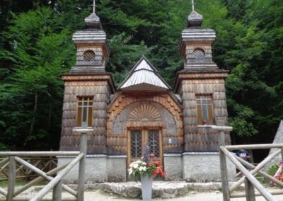 Il giorno seguente prendiamo la strada per il passo di Vršič, nel parco nazionale di Triglav per raggiungere la località di Bled, famosa per il suo lago. La strada, costeggiata dall’immancabile Isonzo, inizia a inerpicarsi sul fianco della montagna e in men che non si dica ci troviamo circondati da boschi. Arrivati a quota 1600 metri ci fermiamo per goderci il panorama e per salutare il grande fiume di Smeraldo e i luoghi della Prima Guerra Mondiale, convinti di esserceli lasciati alle spalle. Scopriamo, però, che nella discesa verso Kranjska Gora c’è una cappella ortodossa. Arrivati alla fine dei tornanti troviamo un parcheggio e notiamo molte persone che si incamminano per un sentiero che reca come indicazione “cappella russa”. Davanti ai nostri occhi svetta una struttura lignea dalle linee ortodosse. Ci fermiamo a leggere la sua storia. Durante la Prima Guerra Mondiale furono i prigionieri russi catturati sul Fronte Orientale a realizzare la strada che tutt’oggi permette di valicare il passo. Purtroppo, durante i lavori una valanga travolse e uccise circa 300 di loro. Venne quindi eretta questa piccola cappella per ricordarne la morte tragica.