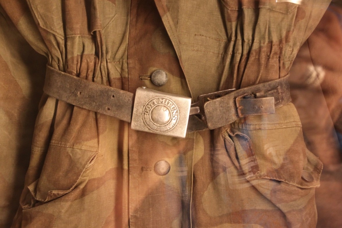 Cinturone tedesco Luftwaffe 1940 della Divisa del Reparto esploratori della Divisione corrazzata paracadutisti Herman Göring: il motto Gott mit uns, in italiano: Dio con noi, era in origine il motto dell’Ordine Teutonico. Dopo la caduta dello stato dei Cavalieri Teutonici, divenne il motto dei re di Prussia, fino a divenire motto degli Imperatori tedeschi. Con l’avvento del Nazismo (1933), la fibbia rimane inalterata fino al 1936, quando, al posto dell’aquila di Weimar, viene inserita un’aquila in posizione di riposo, che ha negli artigli una svastica, lasciando inalterato il motto dell’esercito prussiano.