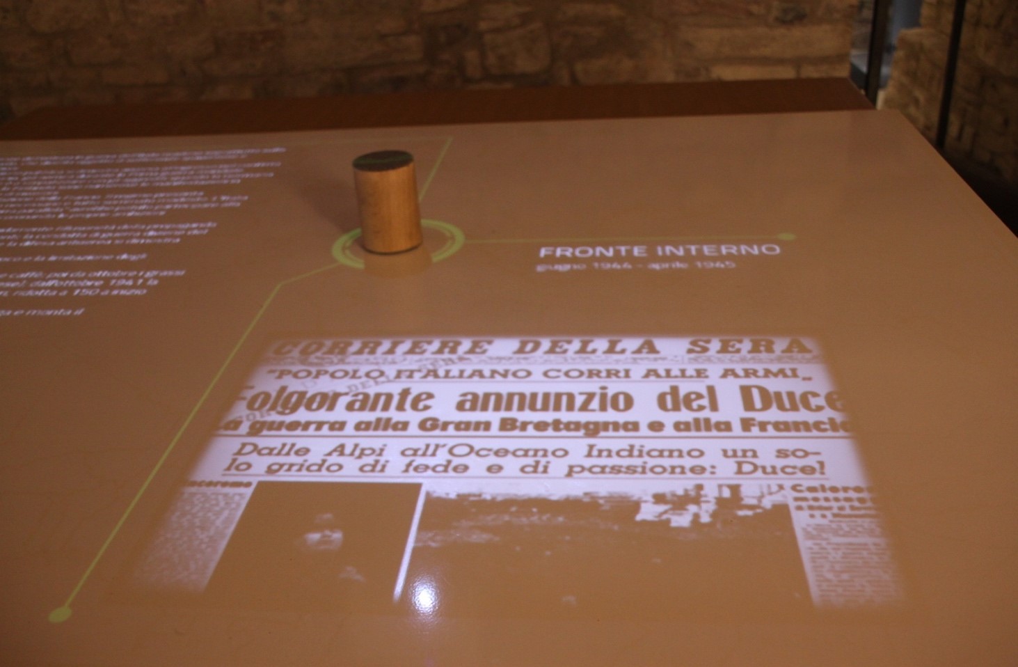 Il tavolo multimediale posto nella Seconda Sala permette al visitatore di esplorare autonomamente attraverso scritti, fotografie, video, pagine di giornale, una cartografia delle guerre messe in atto dal Fascismo.