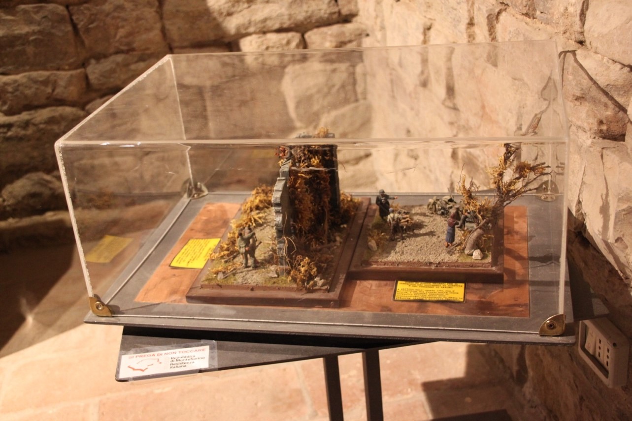 Modellino: Posto di Blocco tedesco per il controllo dei documenti . A partire dall’estate del 1944 i tedeschi assunsero il controllo diretto della zona appenninica, vicino alla Linea gotica: i posti di blocco rappresentano il preludio ai rastrellamenti e alle stragi, che mirano a terrorizzare la popolazione per incrinare la fiducia nelle Forze della Resistenza.
