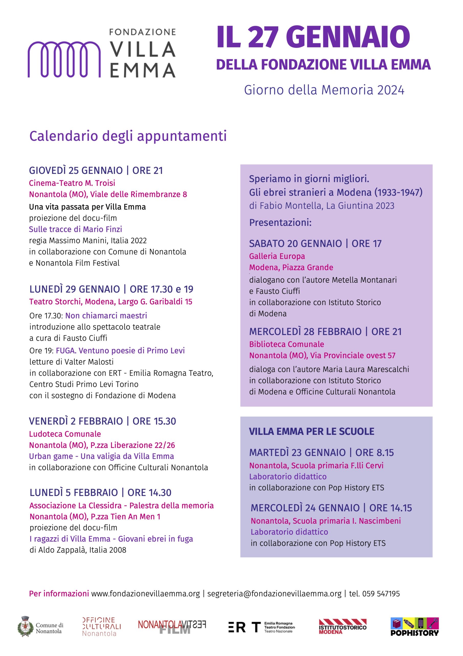 Gli appuntamenti, curati entrambi da Silvia Lotti, sono per martedì 23 gennaio presso la scuola primaria “Fratelli Cervi” e mercoledì 24 presso la scuola primaria “Ida Nascimbeni” di Nonantola. I laboratori rientrano nel quadro delle iniziative promosse da Fondazione Villa Emma all’interno del percorso che condurrà nei prossimi anni alla realizzazione di un nuovo sito memoriale.