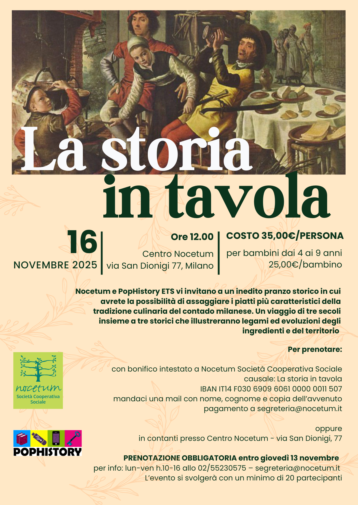 Centro Nocetum e PopHistory ETS invitano a un inedito pranzo storico, pensato per far rivivere i piatti più caratteristici della tradizione del contado milanese. Sarà un percorso lungo tre secoli, arricchito dal racconto di tre storici che accompagneranno i commensali alla scoperta degli ingredienti, delle trasformazioni e dei legami che hanno segnato la storia del territorio.