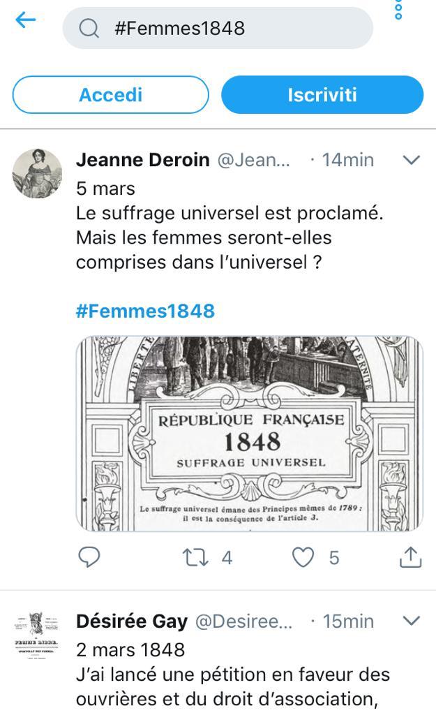 Divertente e mai banale è stata anche l’idea di trasportare il dibattito femminile sull’inclusione delle donne nella conquista dei nuovi diritti di libertà e di partecipazione alla vita sociale e politica dai giornali del XIX secolo a Twitter. Uno scambio serrato di tweet a effetto, dichiarazioni e provocazioni con tanto di profili appositamente creati e hashtag attraverso cui tutti i partecipanti all’evento potevano seguire in diretta gli scambi e perfino intervenire! La conduzione del dibattito affidata alla storica Mathilde Larrère ha garantito l’adeguata contestualizzazione storica degli eventi e dei personaggi protagonisti del dibattito, mescolando in modo efficace la ricostruzione storica ed il linguaggio scanzonato del web.