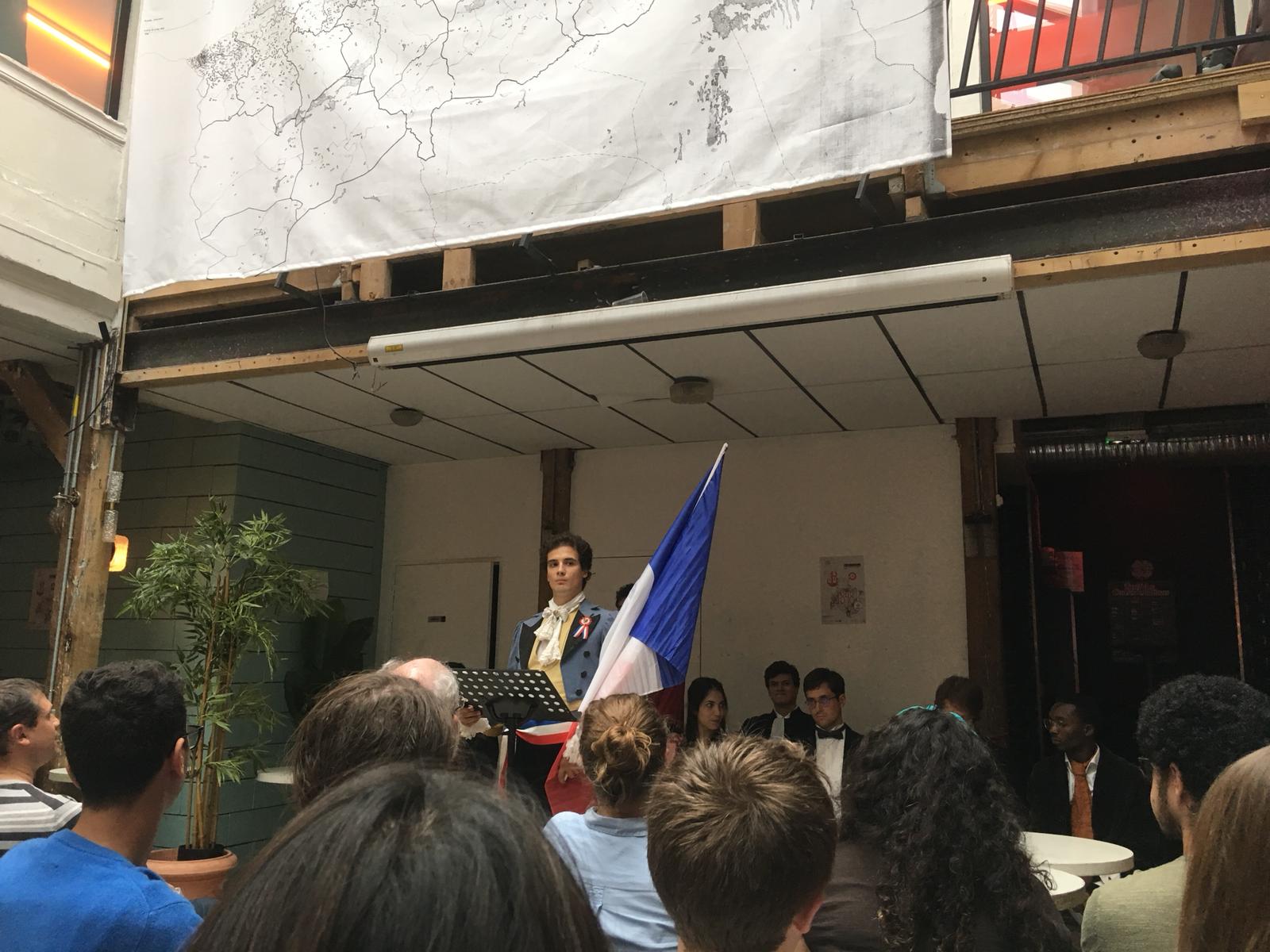 Nel 1848 le fazioni protagoniste della rivolta parigina si confrontavano nei posti più svariati, dai salotti privati fino agli Ateliers Nationaux, discutendo del futuro della Francia. Magari con un bel croissant in mano! È con questo spirito che, la mattina del 22, il pubblico ha vivacemente discusso delle più svariate tematiche che, allora come oggi, infiammano i dibattiti pubblici: economia, governo, politica estera e vita quotidiana. Ognuno poteva prendere la parola in qualsiasi momento e, in base al proprio assenso o meno, ci si poteva fisicamente schierare accanto al propugnatore di una data opinione. A ciò è poi seguito una tavola rotonda quanto mai singolare, tutta dedicata a quello che nel mondo delle fiction si chiama Alternative Universe, avente per domanda “E se la schiavitù non fosse stata abolita?”. Il pubblico ha discusso, immaginato e proposto a briglia sciolta, ma la verosimiglianza dell’insieme è stata garantita dalla presenza di storici professionisti, il cui compito era di costruire scenari credibili sulla base delle idee che dal pubblico venivano. Il tutto – per l’appunto – davanti ad una tavolata di croissant. Ma è stato durante il pranzo organizzato dai festivalieri che si è davvero potuto respirare e toccare con mano lo spirito quarantottesco. Organizzando un vero e proprio banchetto rivoluzionario (Un toast à la Révolution), ciascuno dei partecipanti poteva scegliere uno dei brindisi realmente pronunciati nei banchetti rivoluzionari della Parigi del ’48, levarsi e riproporlo all’attenzione degli ormai avvinazzati commensali: in un tripudio di estasi etilico-rivoluzionaria, si sono levati canti simbolo di rivoluzione e resistenza alla tirannia, persino la nostra Bella Ciao.