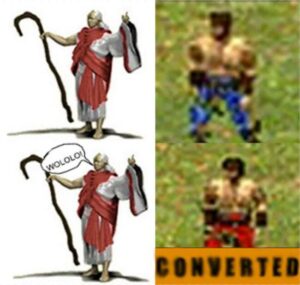 In AoE II non è ben chiara la periodizzazione, che unisce in realtà elementi due elementi quali feudi e castelli che sono coesistenti e non successivi. Legato a questo aspetto c’è la progressione del gioco, impostata ancora con logiche deterministiche: all’avanzamento da un’epoca all’altra coincide con il progresso assoluto della civiltà con cui si sta giocando, ignorando un fenomeno cruciale per il Medioevo quale la Crisi del Trecento. A livello di monumentality gli sviluppatori hanno poi inserito nella versione base 13 civiltà ritenute iconiche e facili da riconoscere per i giocatori – come i Britanni con i longbowmen – facendo però coesistere contemporaneamente popoli della tarda antichità e alto medioevo (Goti e Franchi) con popoli del basso medioevo (Turchi). Ho trovato al contempo interessante l’aggiunta di civiltà “minori” attraverso il rilascio dei DLC, che con l’esclusione di The Conqueror, sono partiti da mod non ufficiali sviluppate dalla community di giocatori e solo in un secondo momento supportate dalla casa madre, con l’intento di espandere i confini delle fazioni giocabili, fosse con l’idea di mostrare l’esistenza di “altro”: di un Global Middle Ages che va oltre le categorie storiografiche, di matrice occidentale, che definiscono il concetto stesso di Medioevo. O forse per cercare un maggior engagement con giocatori di quelle aree geografiche finalizzata a permettere loro di identificarsi con le la fazione giocata. Sono presenti anche elementi di borrowed autenticity quale la capacità dei monaci di convertire unità facendole passare sotto il controllo di giocatori diversi (divenuto uno dei meme più virali tra i giocatori) o la capacità delle reliquie di generare in automatico oro.
