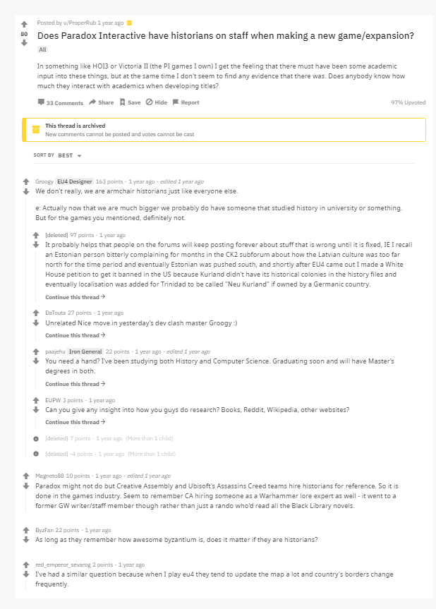 Sul sito ufficiale non ci sono menzioni di consulenze storiche, ma girando tra i forum sono incappato in questa interessante discussione. Gli sviluppatori di Crusader Kings ed Europa Universalis si definiscono “armchair historians just like everyone else” che prendono le loro notizie da “Books, Wikipedia, random website sources” e che basano le modifiche dei contenuti storici sui commenti dei giocatori attivi sui forum delle community. Questo è un tema molto delicato poiché dietro ai suggerimenti delle community possono celarsi sia il professore o studente di Storia sia l’armchair historian che si approcciano al gioco con conoscenze storiche diverse. Infine, c’è la tematica delle mod non ufficiali che possono permettere di ambientare il gioco nell’universo fantasy di Game of Thrones o di Arda oppure diffondere odio e alimentare il razzismo, su cui la Paradox ben poco può fare a parte rimuoverle dallo Steam Workshop. L’impressione è quella di una gamification molto accentuata che sacrifica la Storia al ruolo di semplice cornice.